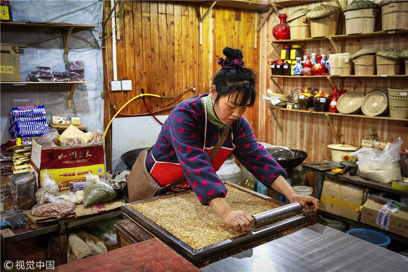 重慶江津區(qū)中山古鎮(zhèn)第十四屆 “千米長宴”民俗文化節(jié)盛大啟幕。上午10時,中山古鎮(zhèn)老街人聲鼎沸,窄窄的青石板路打掃得干干凈凈,家家戶戶門口掛起喜慶的紅燈籠,老商鋪門口擺滿了米酒、烤糍粑、煙熏豆腐……此次“千米長宴”以“絲路情緣,‘?!现猩健睘橹黝}?!扒组L宴”期間,游客們不僅可以一雙筷子吃遍全街,還可欣賞到祈福祭祀、民俗拜年、“打盆上菜”等表演,同時還增設了以唱、跳、講故事的上菜方式情景演繹愛情主題的文化餐飲,展示富硒愛情宴的文化內涵。圖為街坊們在頭天就開始準備各種菜肴與小吃。