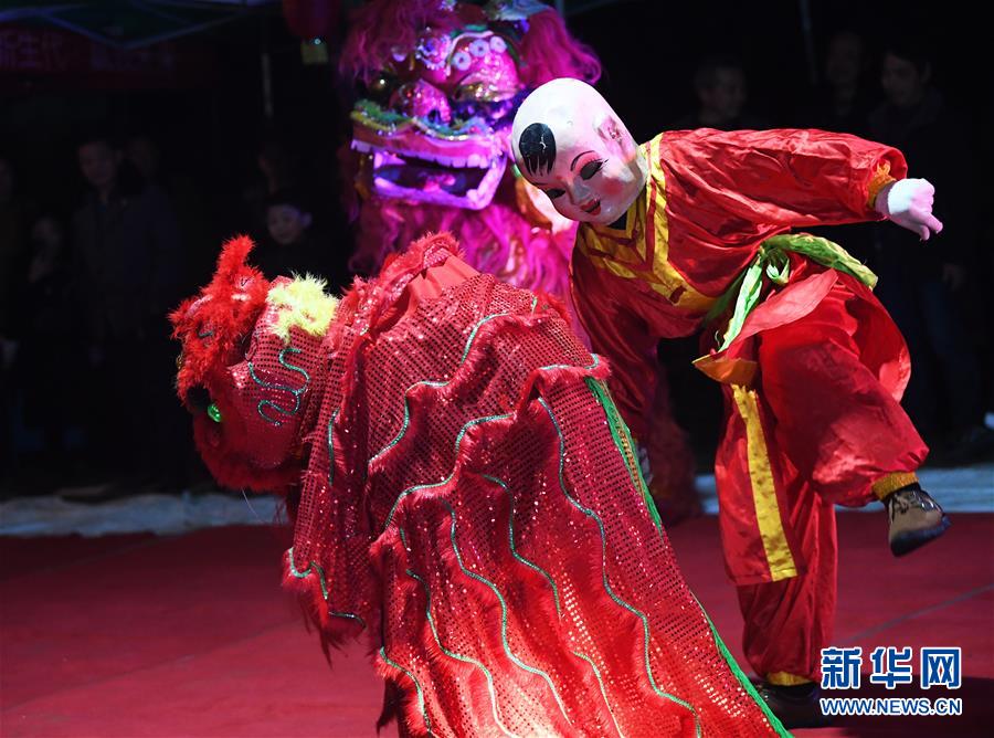 1月31日,隆興村七社村民在“農(nóng)家春晚”上表演獅舞。新華社記者 王全超 攝