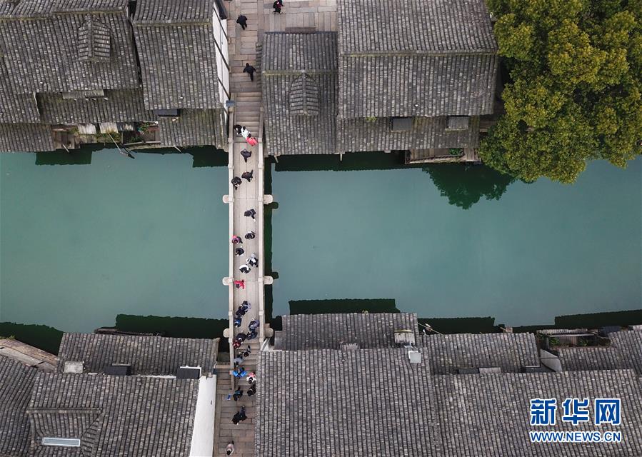 2月25日,游人在烏鎮(zhèn)游覽觀光(無人機(jī)拍攝)。 隨著氣溫升高,浙江省桐鄉(xiāng)市烏鎮(zhèn)景區(qū)春意萌動(dòng)。 新華社記者翁忻旸攝