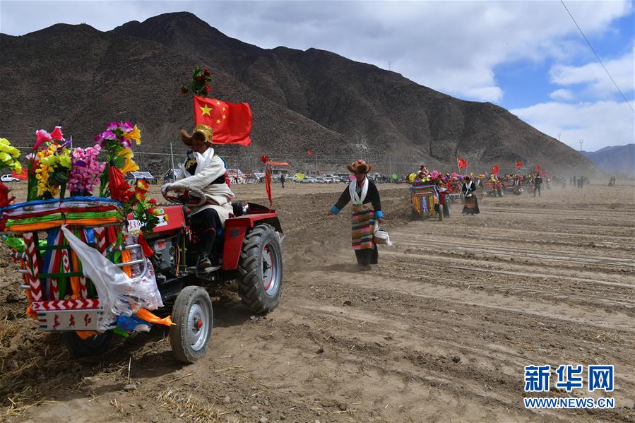 3月16日拍攝的拉薩市達(dá)孜區(qū)唐嘎鄉(xiāng)開耕儀式現(xiàn)場(chǎng)。 當(dāng)日,西藏各地男女老幼身著節(jié)日盛裝,駕著一輛輛由彩旗、花朵裝扮一新的拖拉機(jī),涌向待墾的農(nóng)田,載歌載舞迎來(lái)一年一度的開耕儀式。 新華社記者 張汝鋒 攝