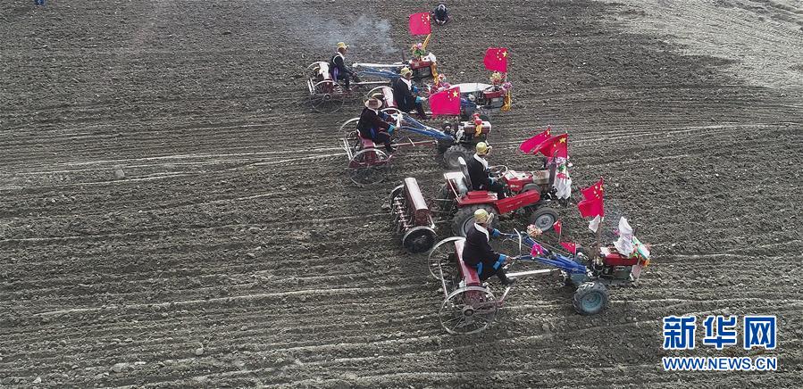 3月16日無(wú)人機(jī)拍攝的山南市乃東區(qū)克松社區(qū)開耕儀式現(xiàn)場(chǎng)。當(dāng)日,西藏各地男女老幼身著節(jié)日盛裝,駕著一輛輛由彩旗、花朵裝扮一新的拖拉機(jī),涌向待墾的農(nóng)田,載歌載舞迎來(lái)一年一度的開耕儀式。新華社記者 晉美多吉 攝
