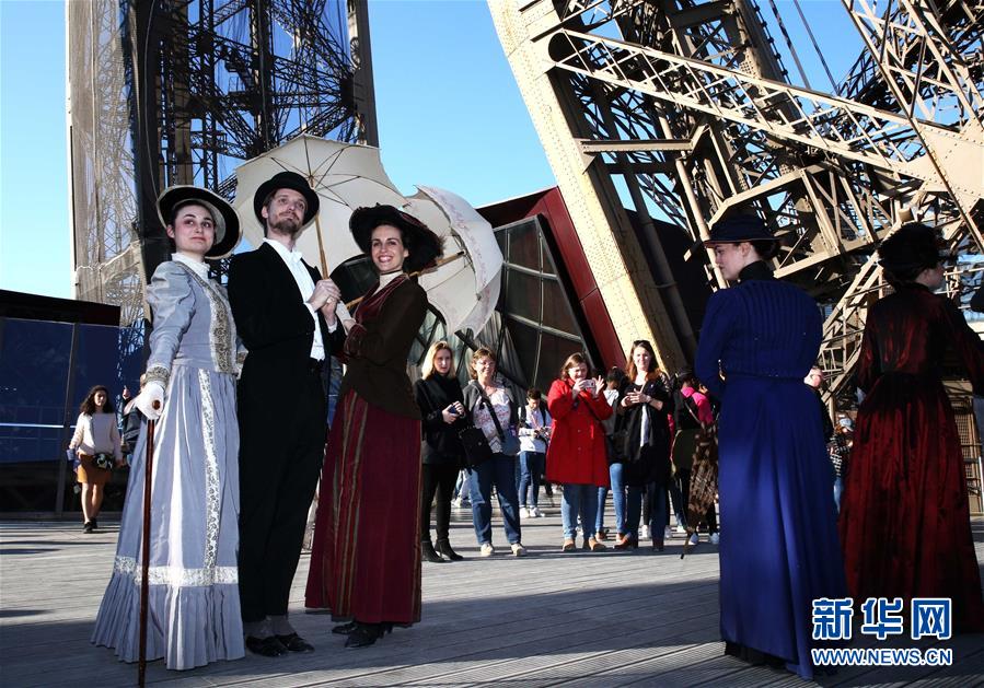 3月30日,在法國巴黎,音樂劇《300米高塔》的演員身著19世紀(jì)服裝在埃菲爾鐵塔一層平臺合影。于1889年3月31日正式落成的法國巴黎埃菲爾鐵塔迎來130歲生日。從30日起,包括演出、冒險(xiǎn)游戲、圖片展在內(nèi)的多項(xiàng)活動在埃菲爾鐵塔舉行,為這座宏偉建筑慶生。新華社記者 高靜 攝