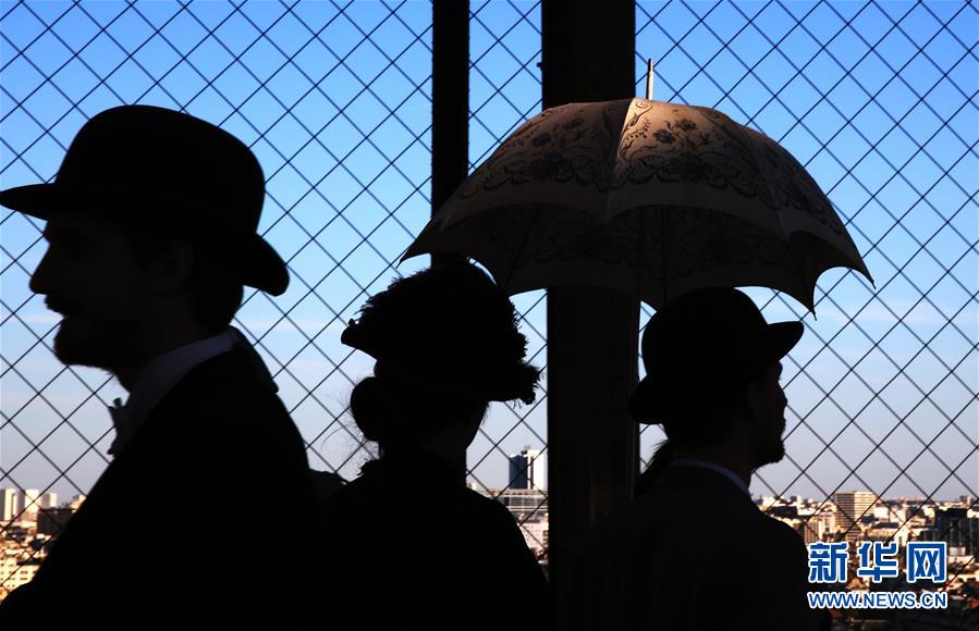 3月30日,在法國(guó)巴黎,音樂劇《300米高塔》的演員身著19世紀(jì)服裝站在埃菲爾鐵塔一層平臺(tái)上。于1889年3月31日正式落成的法國(guó)巴黎埃菲爾鐵塔迎來130歲生日。從30日起,包括演出、冒險(xiǎn)游戲、圖片展在內(nèi)的多項(xiàng)活動(dòng)在埃菲爾鐵塔舉行,為這座宏偉建筑慶生。新華社記者 高靜 攝