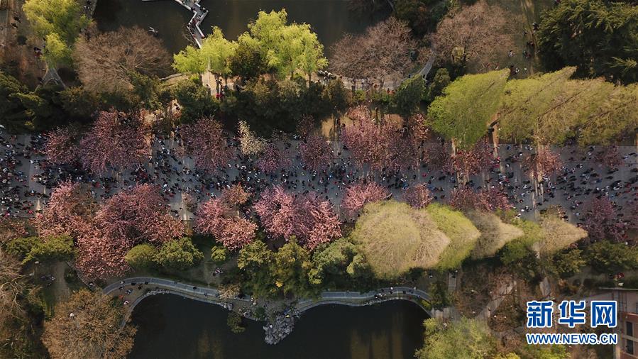 3月31日,游客在中國科學(xué)技術(shù)大學(xué)東區(qū)觀賞櫻花(無人機拍攝)。