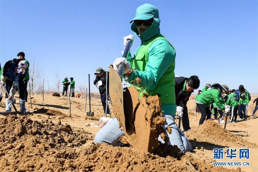 3月31日,參與植樹活動(dòng)的青年志愿者在挖沙坑。 當(dāng)日,200余名中韓兩國(guó)青年志愿者來(lái)到內(nèi)蒙古自治區(qū)達(dá)拉特旗庫(kù)布其沙漠種樹。2006年起,中國(guó)國(guó)際青年交流中心與韓國(guó)韓中文化青少年協(xié)會(huì)組織兩國(guó)青年志愿者在庫(kù)布其沙漠植樹,參與防沙固沙項(xiàng)目。截至目前已植樹850多萬(wàn)株,造林3萬(wàn)多畝。 新華社記者 劉磊 攝