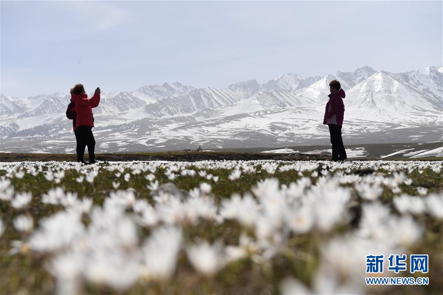 4月4日,游客在新疆那拉提景區(qū)雪山腳下盛開的野百合中拍照。新華社記者 沙達(dá)提 攝
