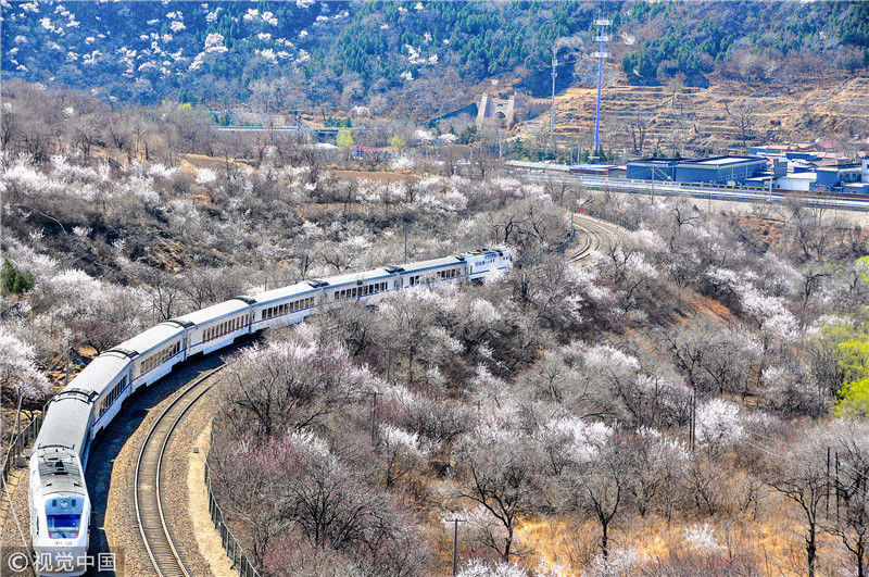 2019年3月22日,北京居庸關(guān)附近的山花盛開,S2線列車穿行在花海之中,構(gòu)成一幅美麗的畫面。時(shí)永平/千龍圖像/視覺中國 編輯/陳進(jìn)