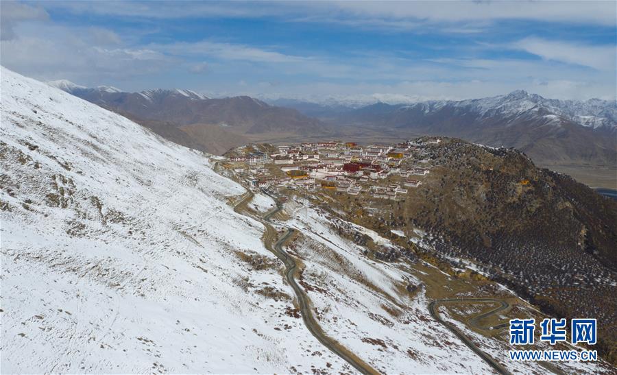 雪后的甘丹寺(4月8日無人機拍攝)。 新華社記者普布扎西攝
