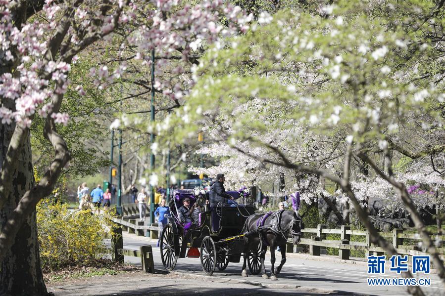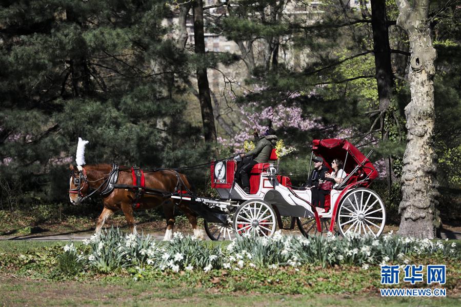 4月16日,人們?cè)诿绹?guó)紐約中央公園乘坐馬車(chē)游玩。  新華社記者 王迎 攝