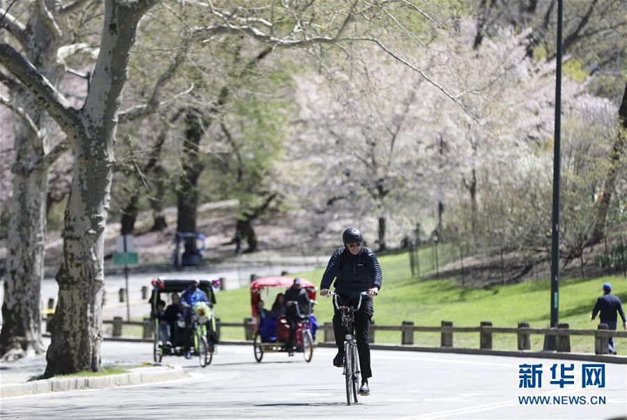 4月16日,人們?cè)诿绹?guó)紐約中央公園騎行。  新華社記者 王迎 攝
