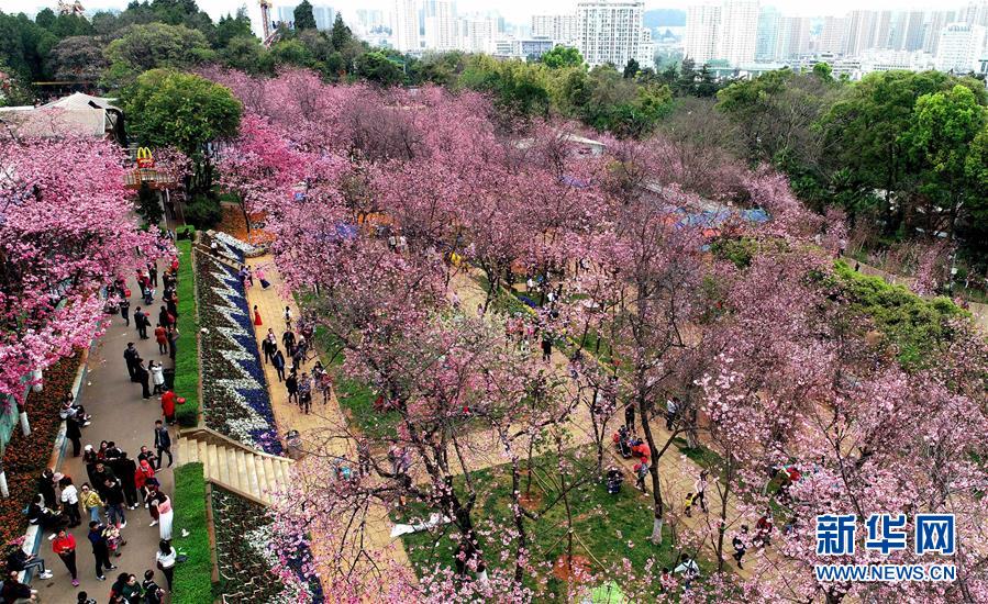游人在云南昆明圓通山公園觀賞盛開(kāi)的櫻花(3月16日無(wú)人機(jī)拍攝)。 新華社記者 秦晴 攝