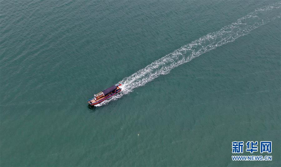 一艘游船行駛在防城港金灘海域(4月16日無人機(jī)拍攝)。新華社記者張愛林?jǐn)z