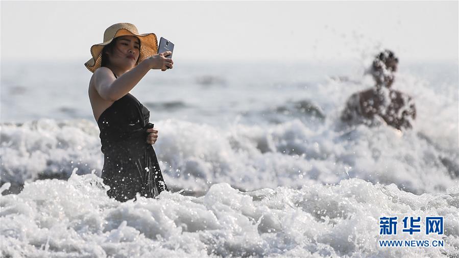 游客在北海市銀灘沖浪戲水(4月18日攝)。新華社記者張愛林攝
