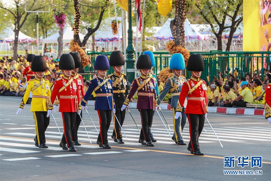 5月5日,儀仗隊在曼谷大王宮附近舉行的泰國國王加冕典禮巡游上列隊前進(jìn)。 新華社記者 張可任 攝