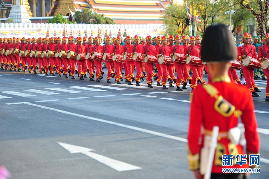 5月5日,儀仗隊在曼谷大王宮附近舉行的泰國國王加冕典禮巡游上列隊前進。  新華社發(fā)(拉亨攝)