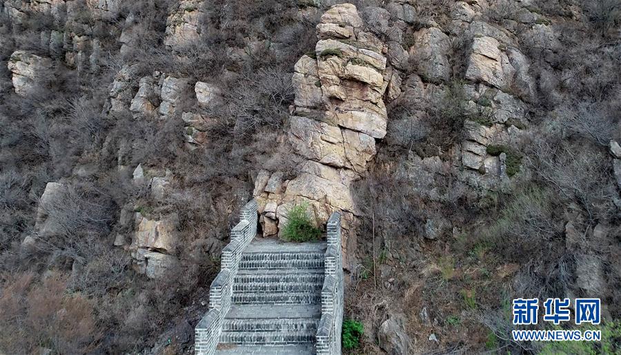 黃崖關(guān)長(zhǎng)城東側(cè)的起點(diǎn)與陡峭的山崖相連(4月18日攝)。新華社記者 岳月偉 攝