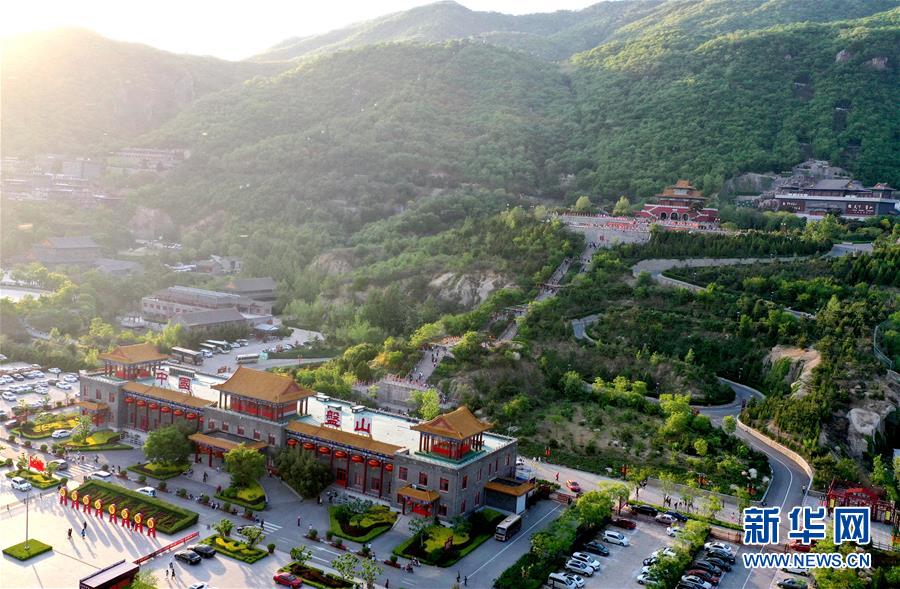 這是5月2日拍攝的盤山風(fēng)景名勝區(qū)正門景觀(無(wú)人機(jī)拍攝)。新華社記者 岳月偉 攝