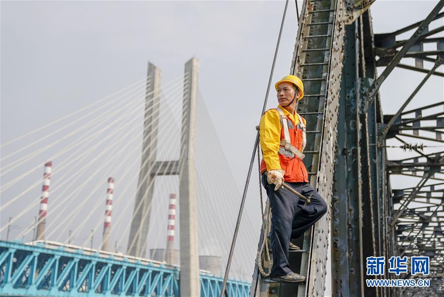 中國鐵路成都局有限公司重慶工務(wù)段53歲的橋隧工唐金華在白沙沱長江大橋的鋼架上檢查鋼梁的銹蝕情況(4月23日攝)。 4月23日下午5點40分,隨著重慶白沙沱長江大橋通行的最后一列客運列車順利通過,這座“服役”了59年的重慶首座長江大橋進入“退役”倒計時。4月24日后,所有列車將改線經(jīng)距白沙沱長江大橋約100米的新白沙沱長江特大橋通行,新橋“接力”老橋,運輸能力將得到大幅提升。 白沙沱長江大橋于1958年開工,1960年通過首趟列車,是繼武漢長江大橋之后的第二座長江大橋。 新華社記者 劉潺 攝