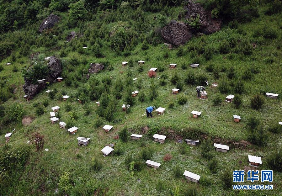 5月10日,在甘肅省隴南市徽縣大河店鎮(zhèn)硬灣村,蜂農(nóng)查看蜂箱情況(無人機(jī)拍攝)。 甘肅省隴南市徽縣大河店鎮(zhèn)硬灣村位于秦巴山區(qū)深處,2017年,在當(dāng)?shù)卣姆龀窒?,龍崖老巢蜜養(yǎng)殖農(nóng)民專業(yè)合作社成立,蜂農(nóng)們將傳統(tǒng)養(yǎng)蜂技藝和現(xiàn)代加工方式相結(jié)合,并通過電商等渠道打開銷路,有效帶動了當(dāng)?shù)刎毨Т迕衩撠氈赂?。目前整個合作社共有蜂箱2000余個,每箱每年可帶來三四千元的收入。 新華社記者 馬寧 攝