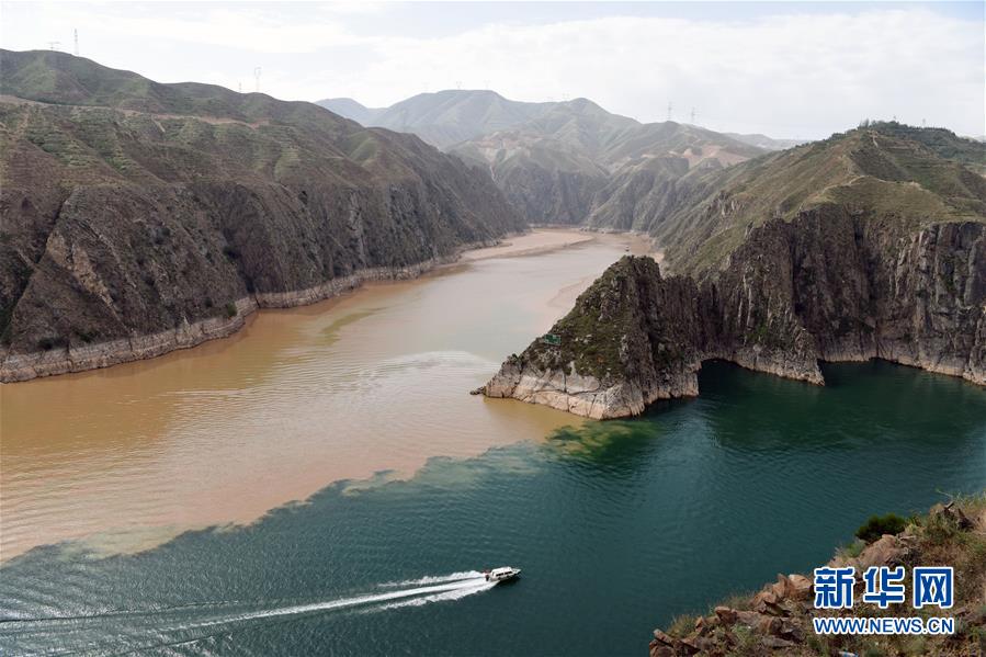 6月2日,在甘肅省臨夏回族自治州永靖縣劉家峽水庫(kù),一艘快艇在洮河和黃河的匯合水域行駛。