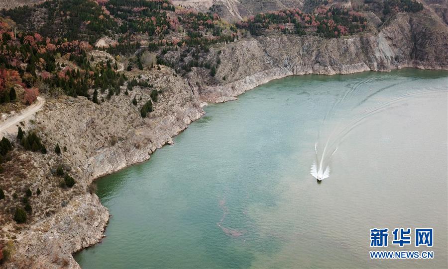 10月24日,一艘快艇從劉家峽水庫(kù)庫(kù)區(qū)駛過(guò)(無(wú)人機(jī)拍攝)。  新華社記者 陳斌 攝