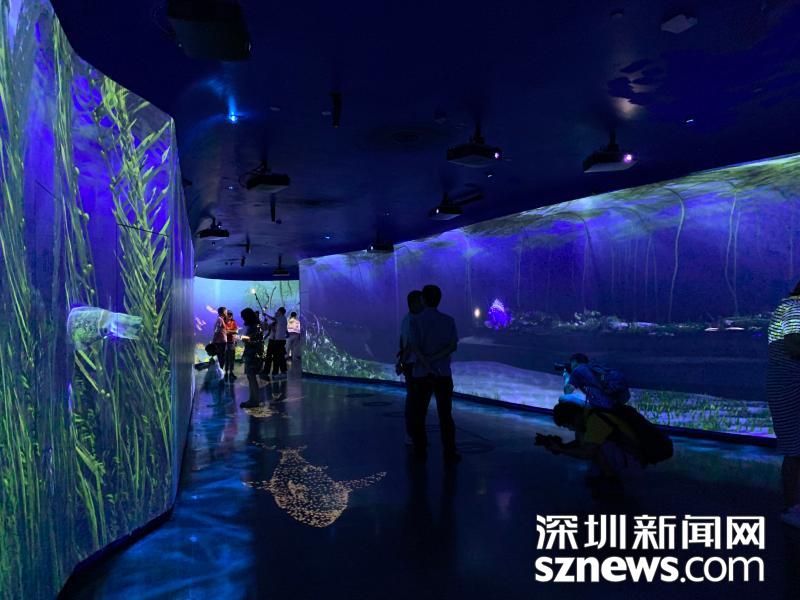 一進(jìn)館,潛入深海的氣息撲面而來,海底生物在身邊若隱若現(xiàn),海底卷起細(xì)小的漩渦,遠(yuǎn)處,神秘的海魚跟你打個照面,轉(zhuǎn)身離開,海底生物和海浪的聲音環(huán)繞耳旁,逼真的特效、巧妙的互動機(jī)制讓人身臨其境,猶如穿越到藍(lán)色大海里,與魚兒作伴,與水母交友,令人沉醉于亦夢亦真的海底世界。