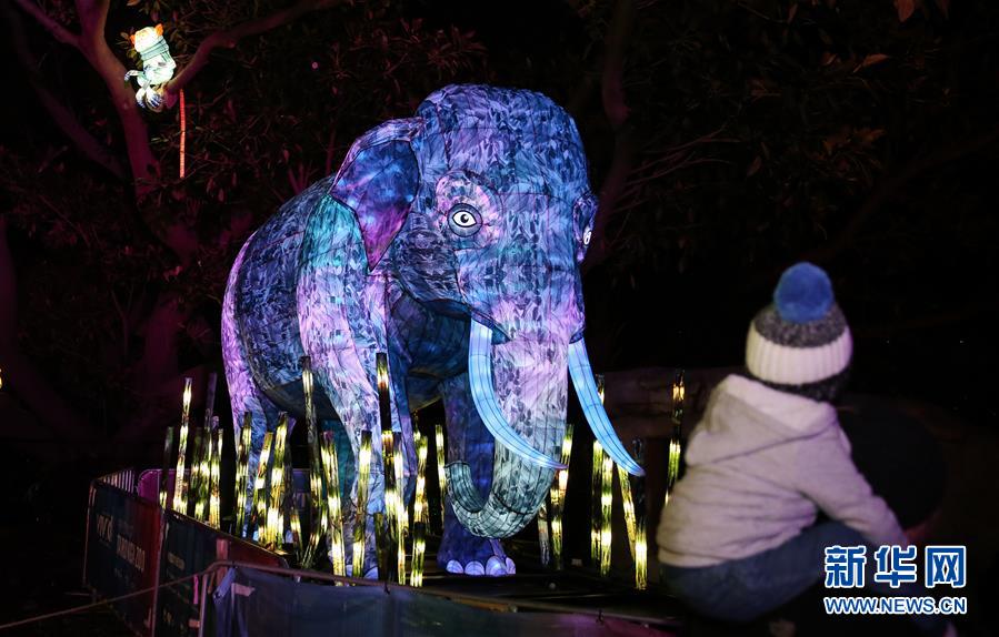 6月8日,在澳大利亞悉尼塔朗加動(dòng)物園,游客參觀大象造型花燈。新華社記者 白雪飛 攝