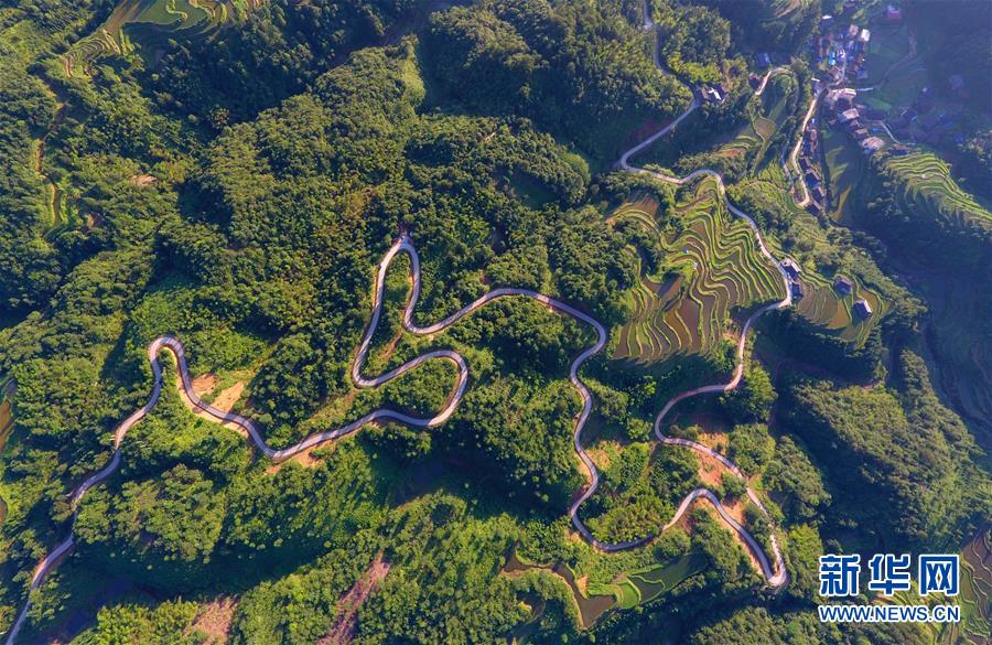 這是融水苗族自治縣桿洞鄉(xiāng)百秀村孔門(mén)苗寨的公路(6月14日無(wú)人機(jī)拍攝)。新華社記者 黃孝邦 攝