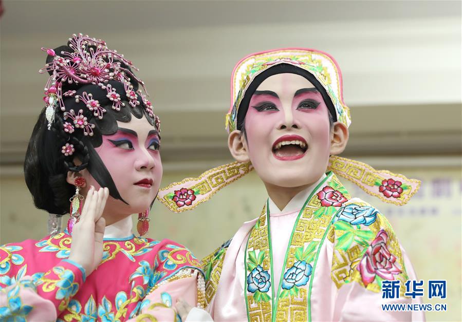 陸瑞徽(左)和利文喆在表演折子戲《艷曲醉周郎》(6月8日攝)。 聲輝粵劇推廣協(xié)會成立于2003年,是香港重要粵劇藝術(shù)團(tuán)體之一,致力于向青少年推廣粵劇。協(xié)會目前有兩個(gè)初班,3個(gè)中班,一個(gè)青少年班。粵劇又稱“廣東大戲”,表演技藝包括“唱做念打”,即唱功、身段、臺詞、武打,主要流行于廣東、廣西和香港、澳門等地區(qū)。2009年,粵劇被列入聯(lián)合國教科文組織人類非物質(zhì)文化遺產(chǎn)代表作名錄,今年正逢十周年。 新華社記者 吳曉初 攝