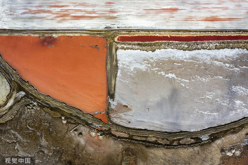當(dāng)?shù)貢r(shí)間2019年6月11日,航拍納米比亞沃爾維斯灣五彩鹽田。鹽田總面積達(dá)3500公頃(35平方千米),南非近90%的鹽都由該地供應(yīng),鹽田中生長(zhǎng)的海藻和鹽濃度不同造成鹽田呈現(xiàn)出多種色彩,照片由自由攝影師Franco Cappellari使用無人機(jī)拍攝。