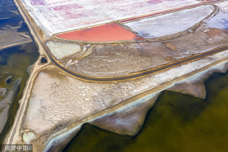 這片俯拍的鹽田總面積達(dá)3500公頃(35平方千米),因?yàn)楫?dāng)?shù)睾T搴望}的濃度不同造成了鹽田的不同色彩。