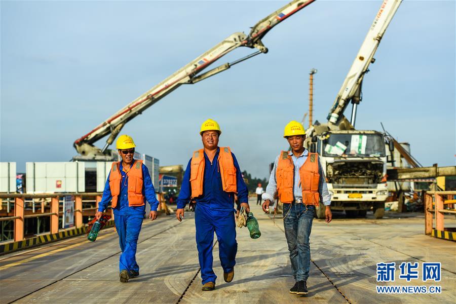 中鐵大橋局施工人員行走在湛江調(diào)順跨海大橋臨時(shí)鋼棧橋上(7月6日攝)。 新華社記者 劉大偉 攝