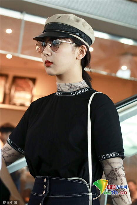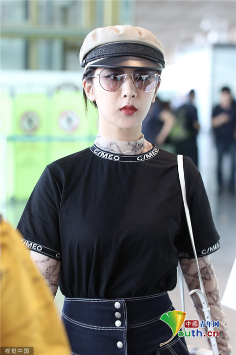 2019年7月25日,北京,楊紫現(xiàn)身機場。她穿黑色短T配牛仔裙變時髦女郎,戴報童帽架墨鏡”港風(fēng)女sir“即視感,人氣爆棚。