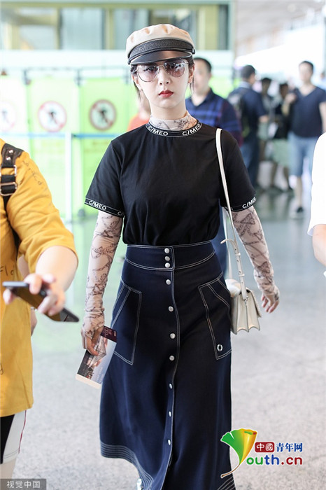 2019年7月25日,北京,楊紫現(xiàn)身機場。她穿黑色短T配牛仔裙變時髦女郎,戴報童帽架墨鏡”港風(fēng)女sir“即視感,人氣爆棚。