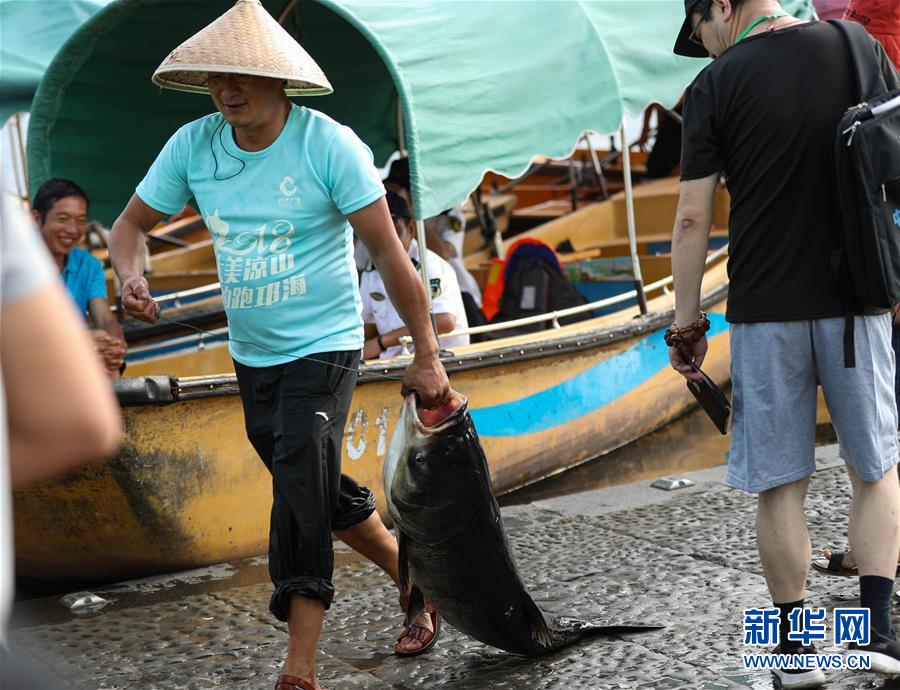 7月27日,在西昌邛海,一名漁民捕得一條大魚。新華社記者江宏景攝