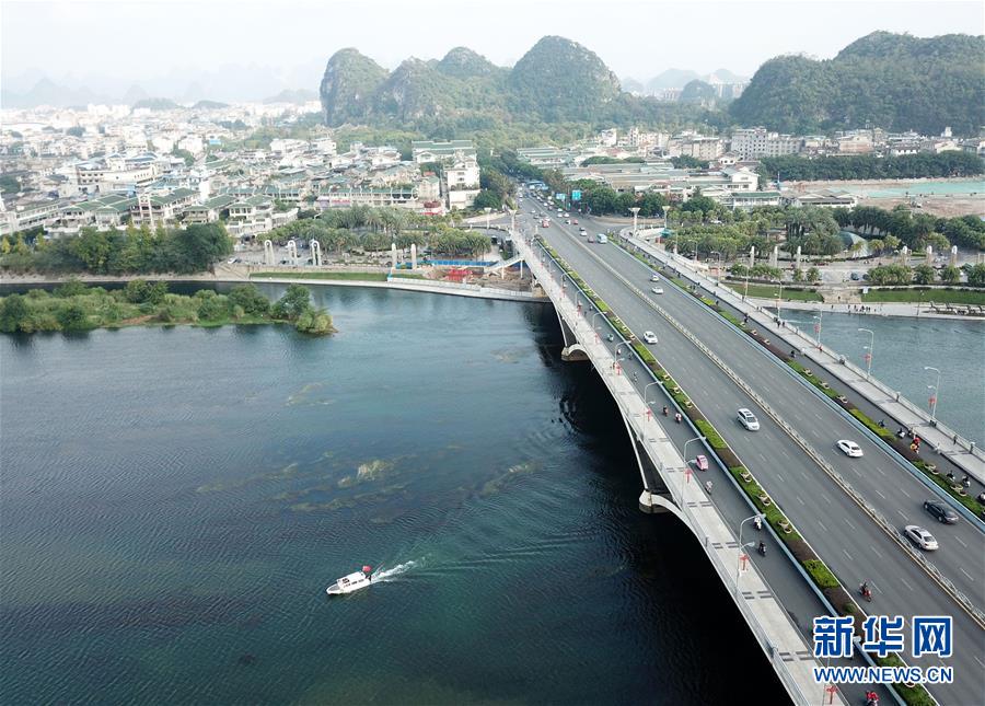 船只從橫跨漓江的廣西桂林市解放橋旁駛過(10月17日無人機(jī)拍攝)。 新華社記者 周華 攝