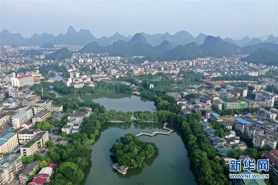 桂林市榕湖附近景觀(7月1日無人機(jī)拍攝)。 夏日時節(jié),廣西桂林市區(qū)內(nèi)的榕湖、杉湖、桂湖、木龍湖等地綠樹成蔭、景色迷人。 新華社記者陸波岸攝