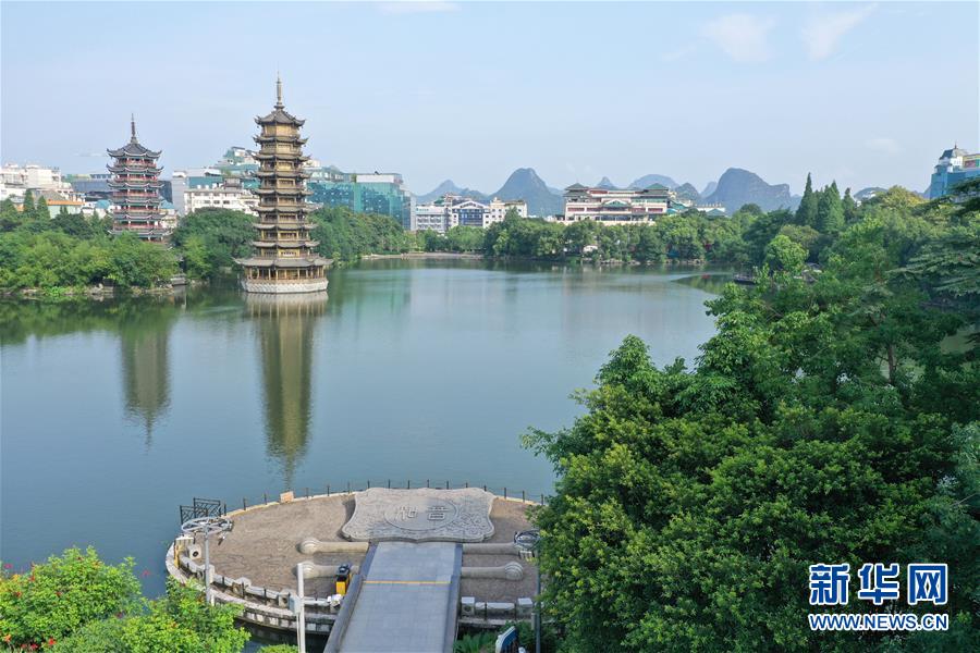 桂林市杉湖景觀(7月1日無人機(jī)拍攝)。 夏日時節(jié),廣西桂林市區(qū)內(nèi)的榕湖、杉湖、桂湖、木龍湖等地綠樹成蔭、景色迷人。 新華社記者陸波岸攝