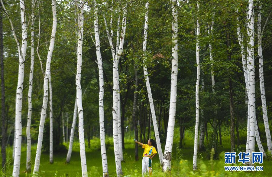8月8日,游客在伊春市九峰山養(yǎng)心谷景區(qū)白樺林里自拍。 時值八月,黑龍江省伊春市林區(qū)空氣清新,涼爽宜人,吸引眾多游客。 新華社記者李曉果攝