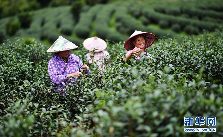 五指山市水滿鄉(xiāng)毛腦村貧困戶王金花(右一)在五指山椰仙茶園采茶,她在2012年進入茶園工作,2016年脫貧(2018年11月15日攝)。新華社記者郭程攝