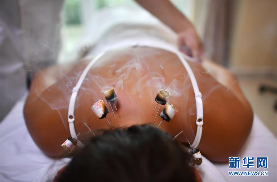 俄羅斯游客維多利亞·米哈拉普在三亞國際友好中醫(yī)療養(yǎng)院進行中醫(yī)理療(2018年6月2日攝)。新華社記者郭程攝