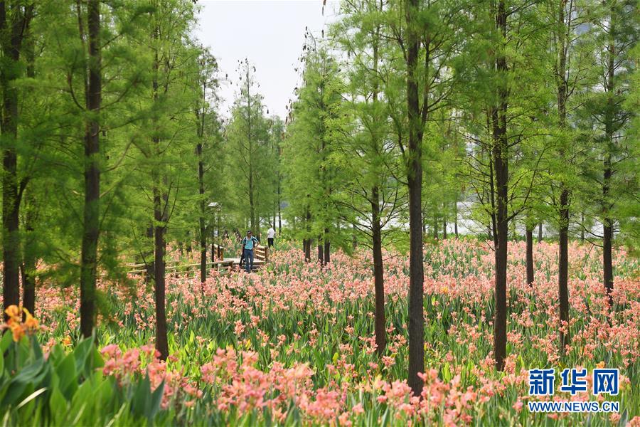 人們在廣東佛山東平河濱河濕地景觀帶游覽(4月9日攝)。 新華社記者 梁旭 攝