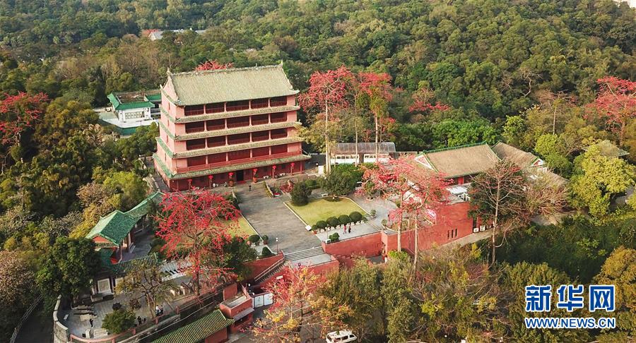 盛開的木棉花和坐落在廣州越秀山上的鎮(zhèn)海樓交相輝映(2月22日無人機拍攝)。 新華社記者 鄧華 攝
