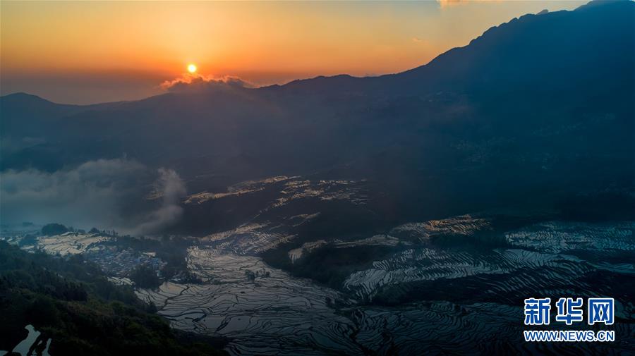 在云南省元陽縣拍攝的晨曦中的哈尼梯田(4月4日無人機拍攝)。 新華社記者胡超攝