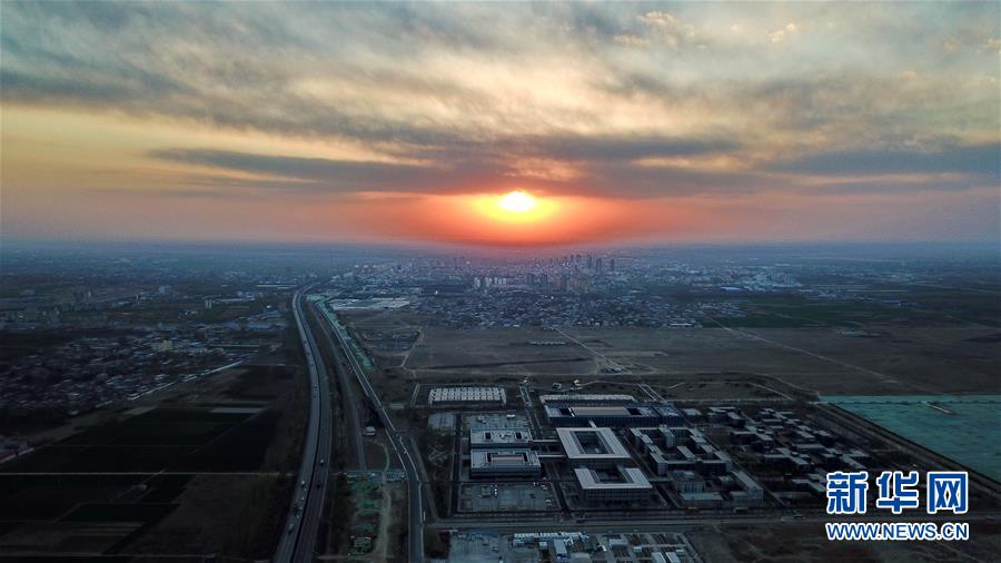 3月31日無人機(jī)拍攝的雄安新區(qū)市民服務(wù)中心(前)遠(yuǎn)處為容城縣城區(qū)。新華社記者牟宇攝