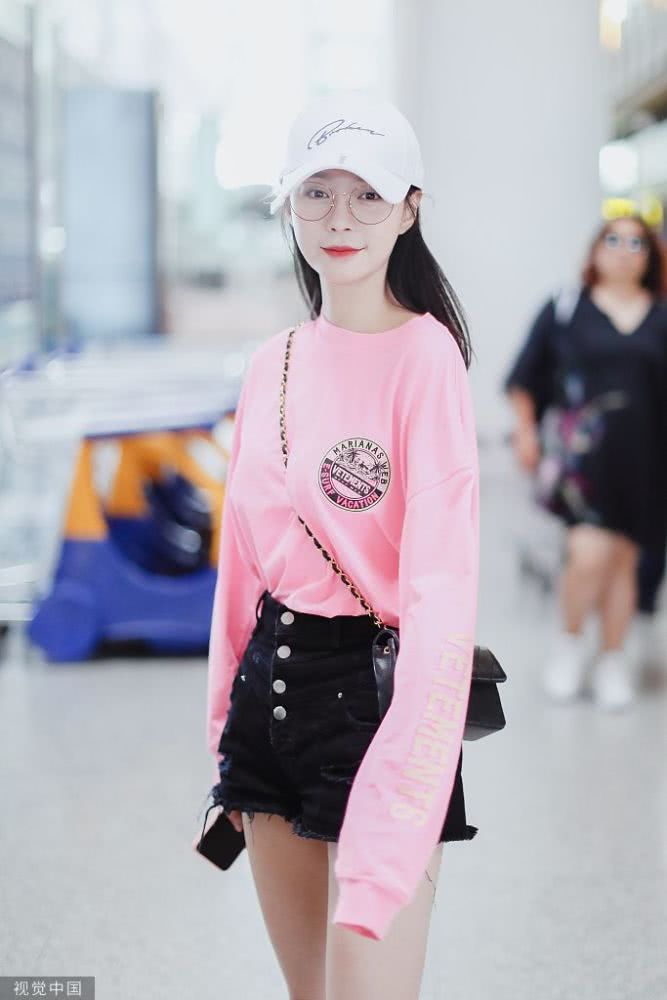 她戴著棒球帽身穿粉色衛(wèi)衣搭配熱褲,長腿纖細又白嫩。