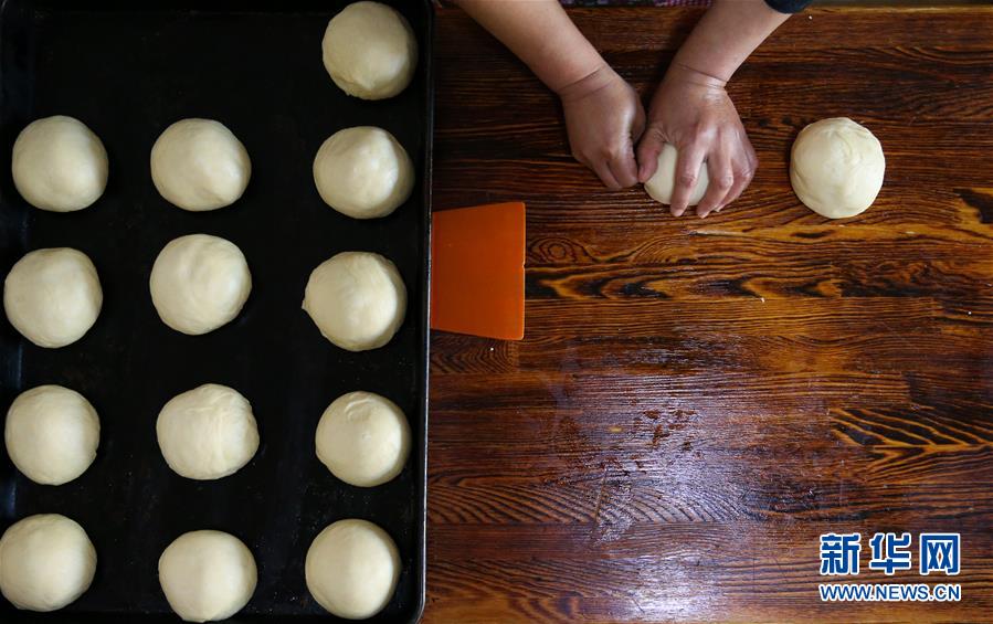 8月29日,付艷梅將發(fā)酵好的面團揉捏成型。新華社記者淡航攝
