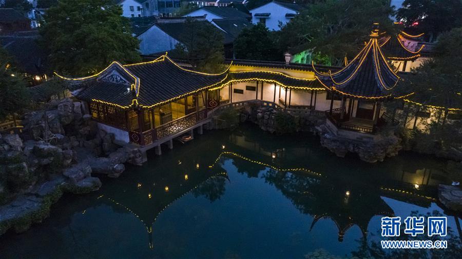 這是5月22日晚拍攝的蘇州網(wǎng)師園(無(wú)人機(jī)拍攝)。網(wǎng)師園是唯一在夜間面向公眾開(kāi)放的蘇州園林。  新華社記者 沈伯韓 攝