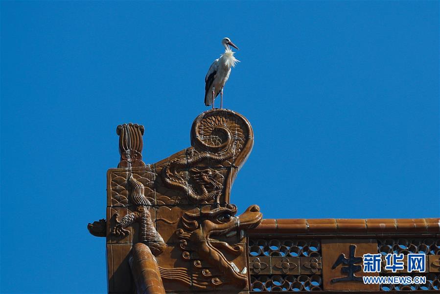 8月24日,在比利時(shí)布呂熱萊特市,一只白鸛站在天堂動(dòng)物園“中國(guó)園”的建筑上。新華社記者 鄭煥松 攝