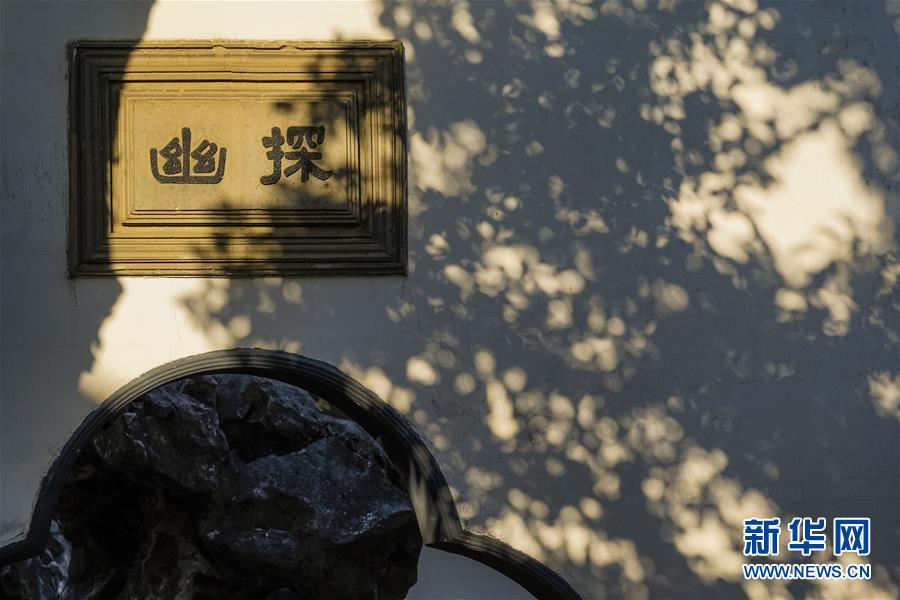 這是蘇州獅子林墻壁上的斑駁樹(shù)影(5月23日攝)。  新華社記者 沈伯韓 攝
